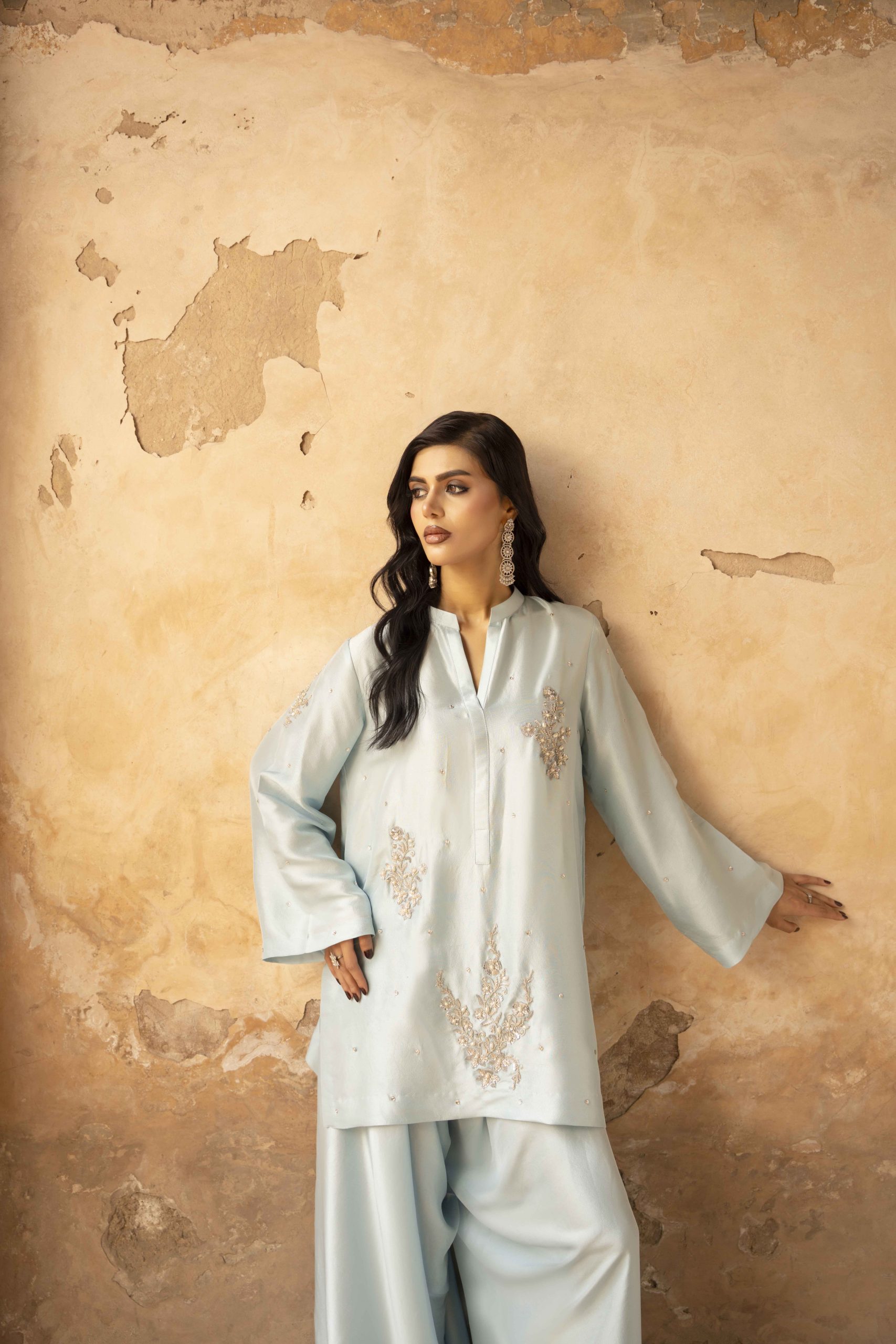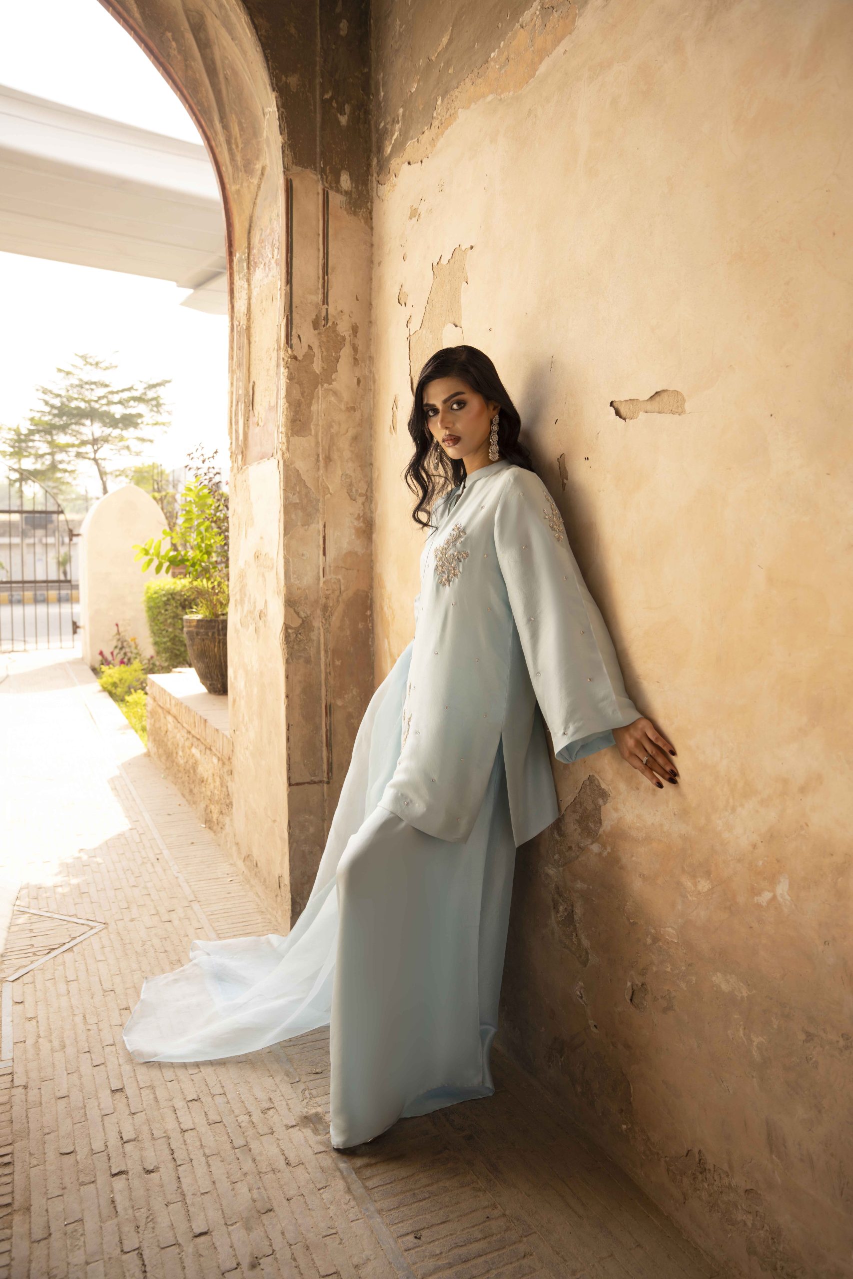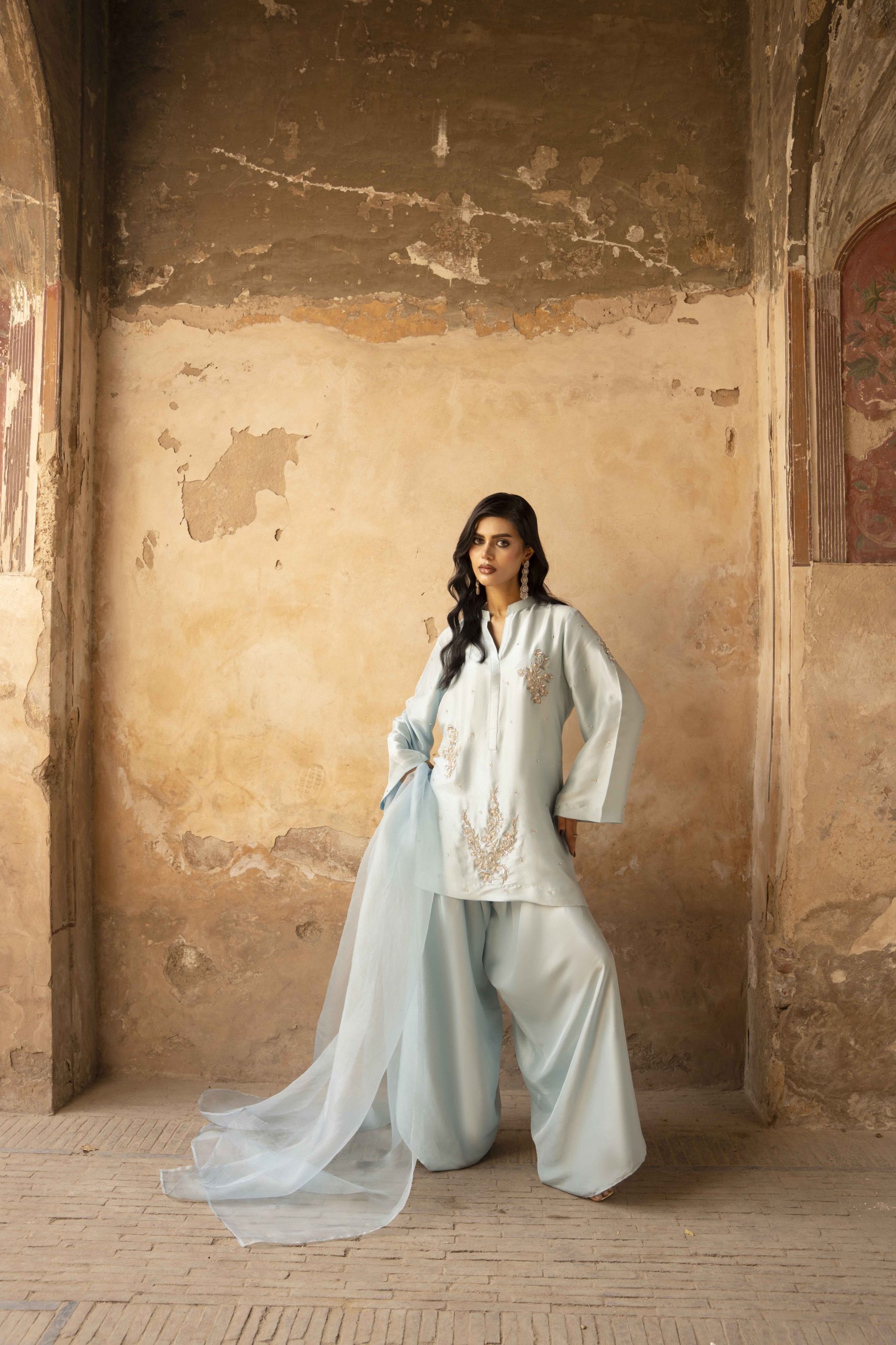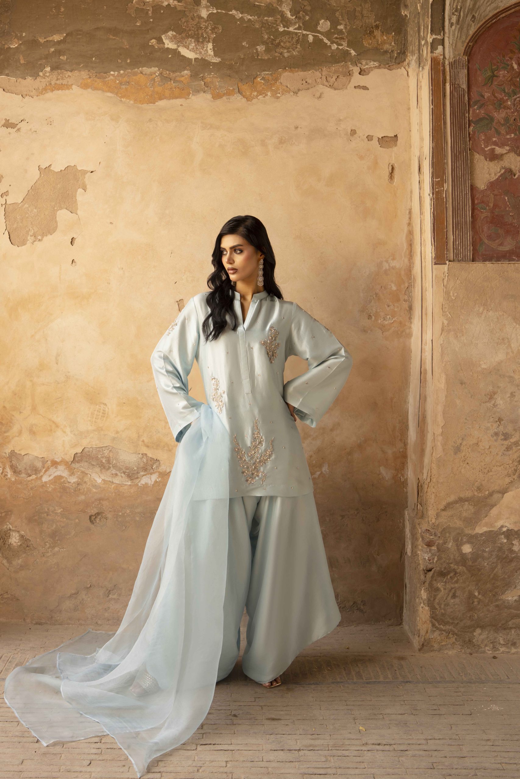 A vision in serenity — Azure Bloom features a finely tailored pure hand-made raw silk shirt 80 gram, gracefully paired with wide-leg raw silk pants. The look is elevated with a dreamy organza dupatta, creating an aura of effortless sophistication. Each hand-embellished motif adds a whisper of luxury, making this ensemble perfect for elegant soirées, festive brunches, or timeless celebrations.