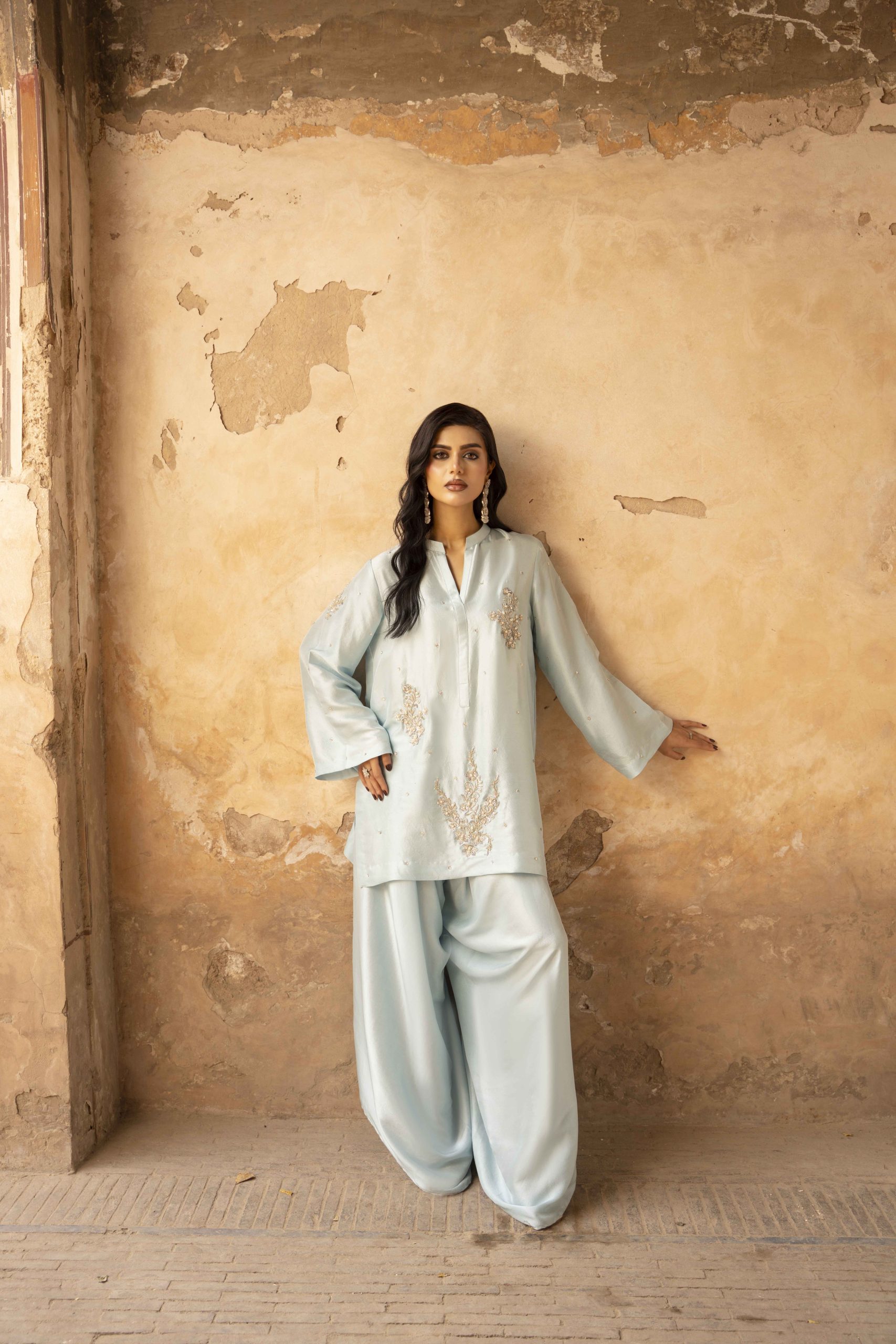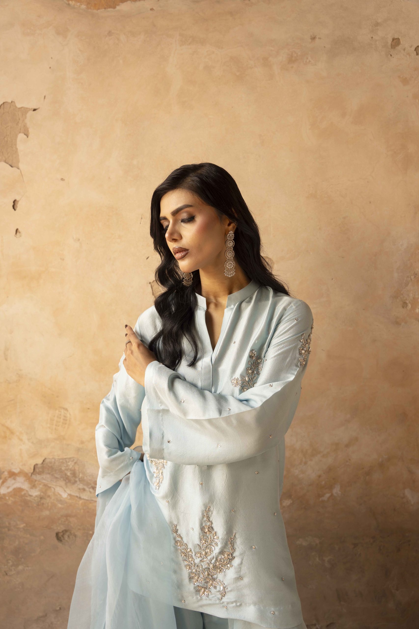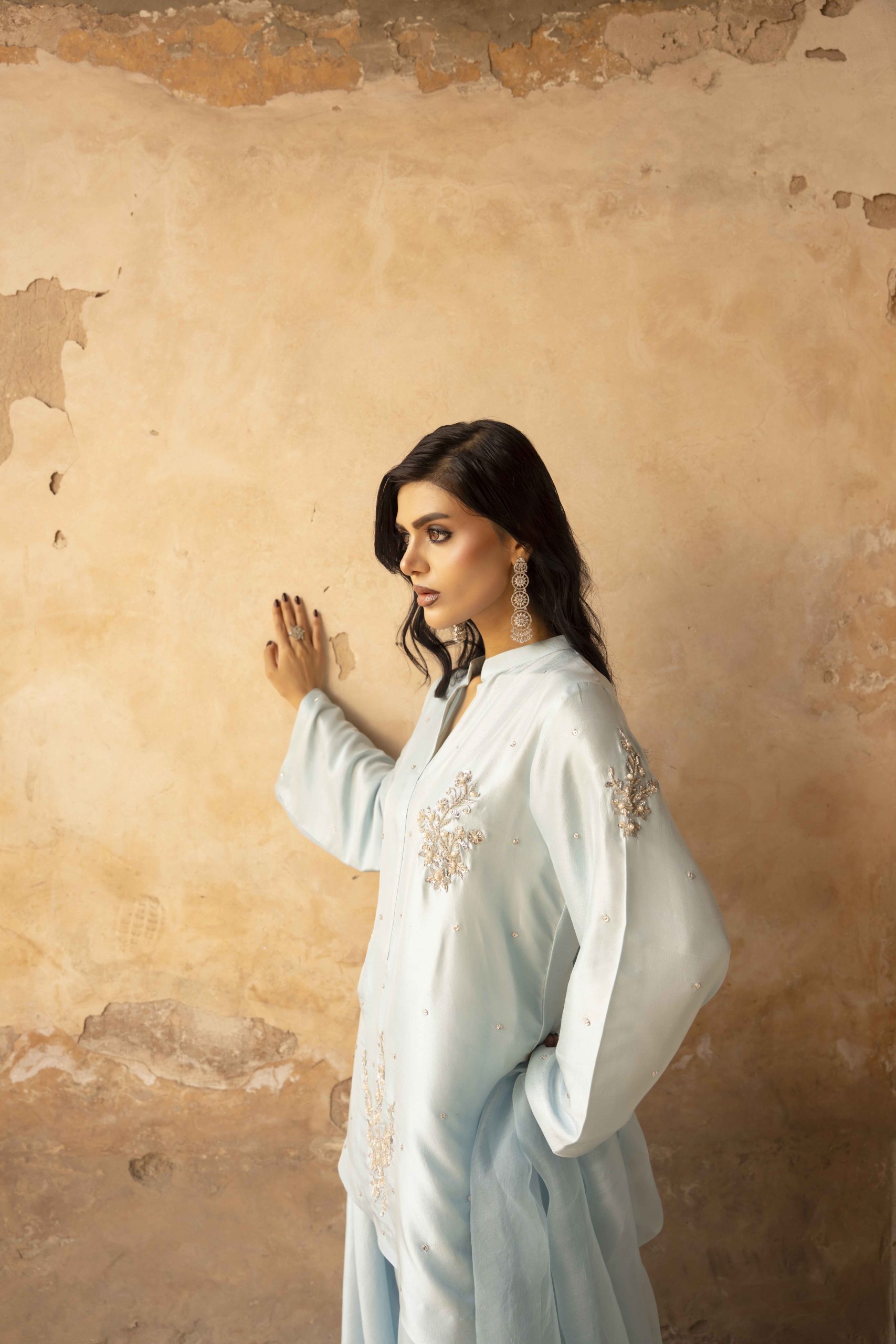 A vision in serenity — Azure Bloom features a finely tailored pure hand-made raw silk shirt 80 gram, gracefully paired with wide-leg raw silk pants. The look is elevated with a dreamy organza dupatta, creating an aura of effortless sophistication. Each hand-embellished motif adds a whisper of luxury, making this ensemble perfect for elegant soirées, festive brunches, or timeless celebrations.