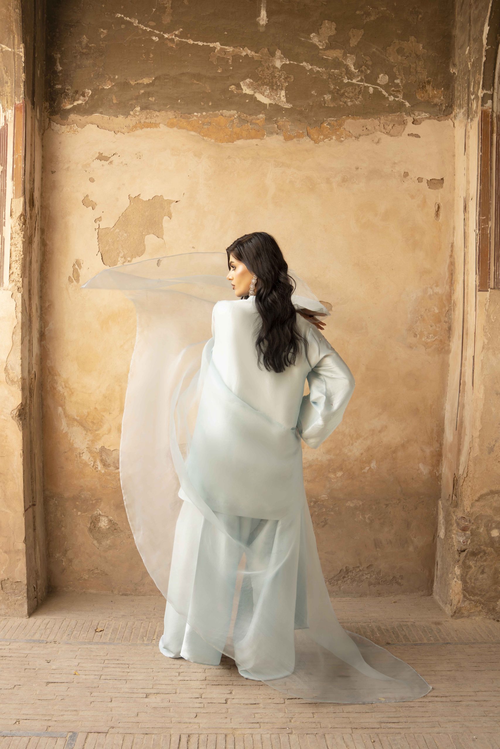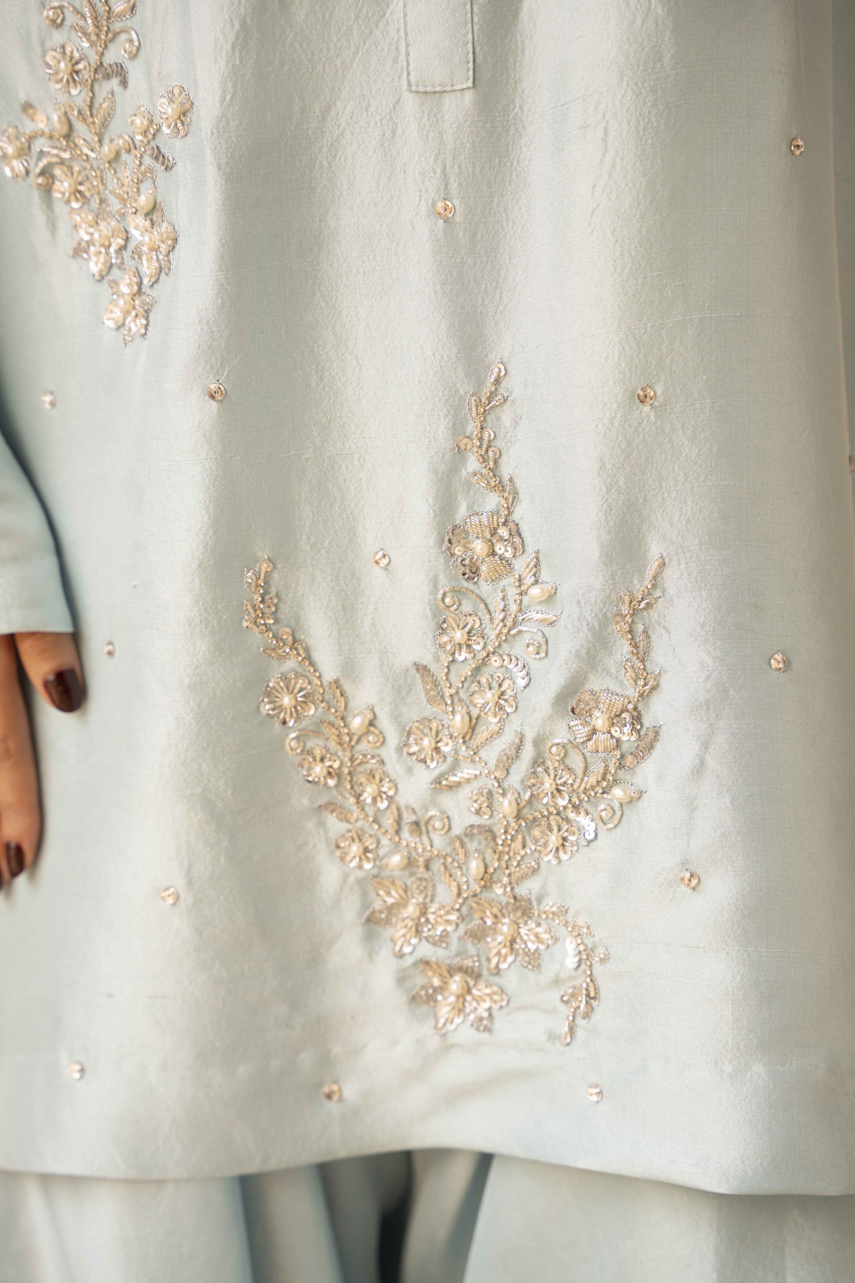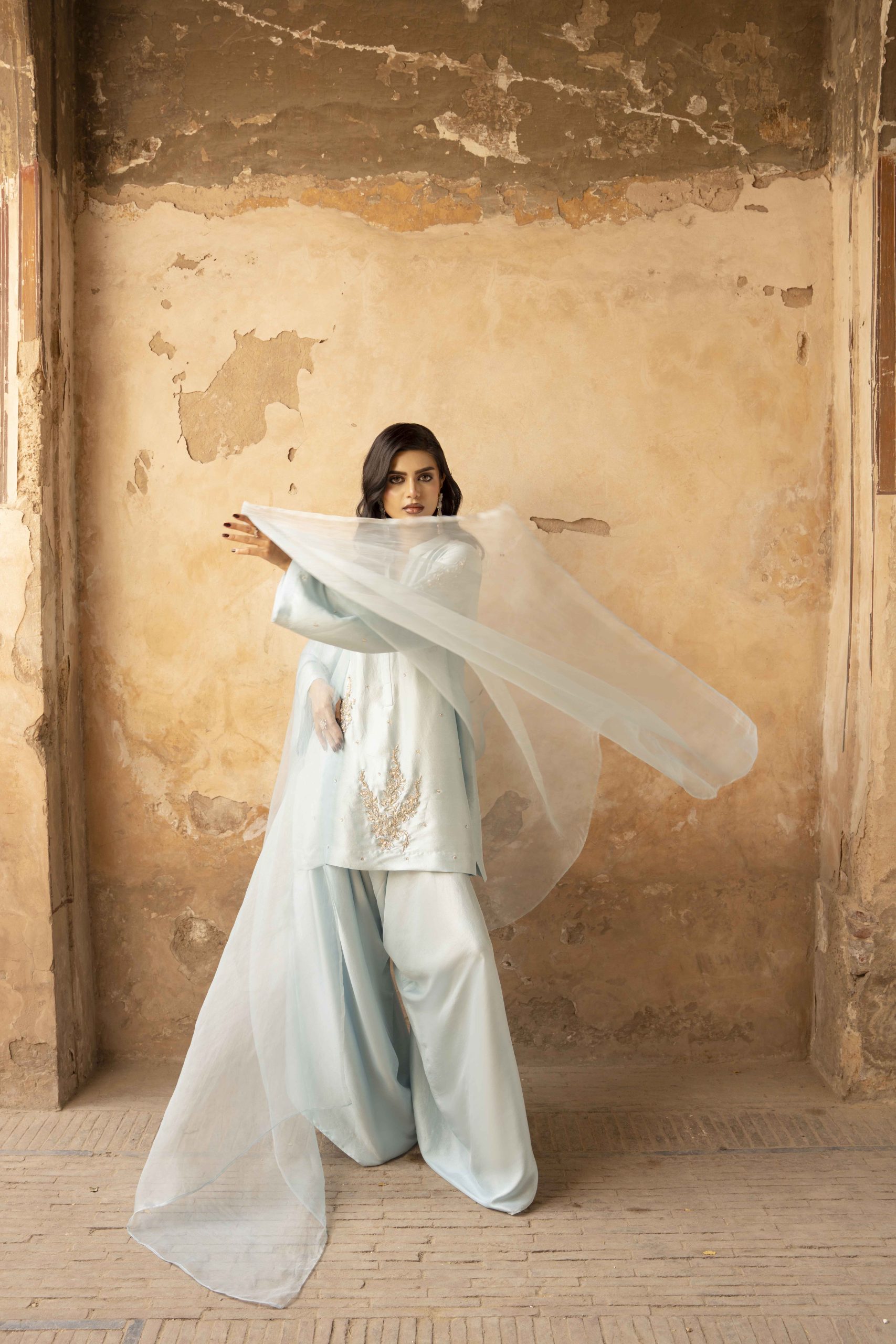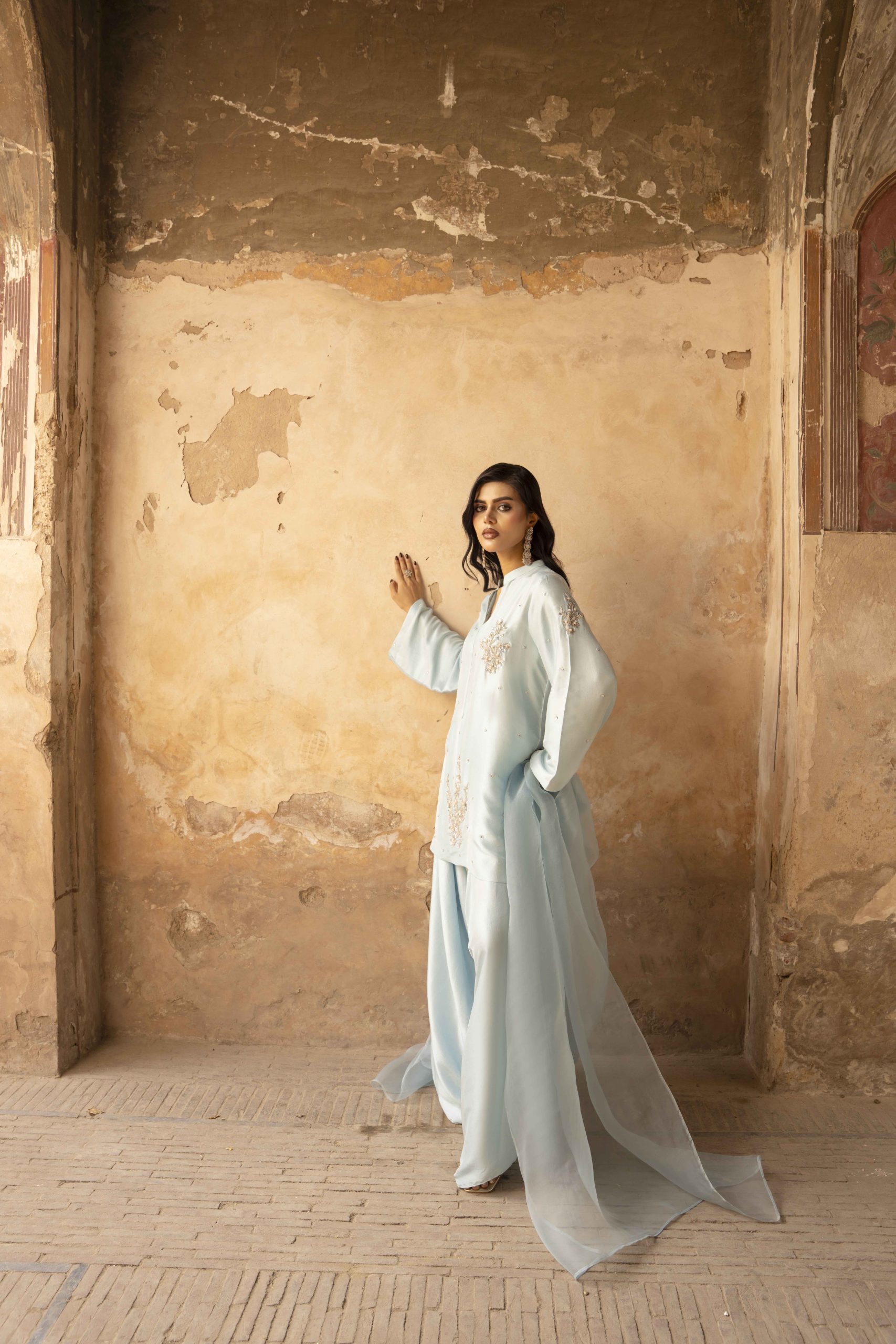 A vision in serenity — Azure Bloom features a finely tailored pure hand-made raw silk shirt 80 gram, gracefully paired with wide-leg raw silk pants. The look is elevated with a dreamy organza dupatta, creating an aura of effortless sophistication. Each hand-embellished motif adds a whisper of luxury, making this ensemble perfect for elegant soirées, festive brunches, or timeless celebrations.