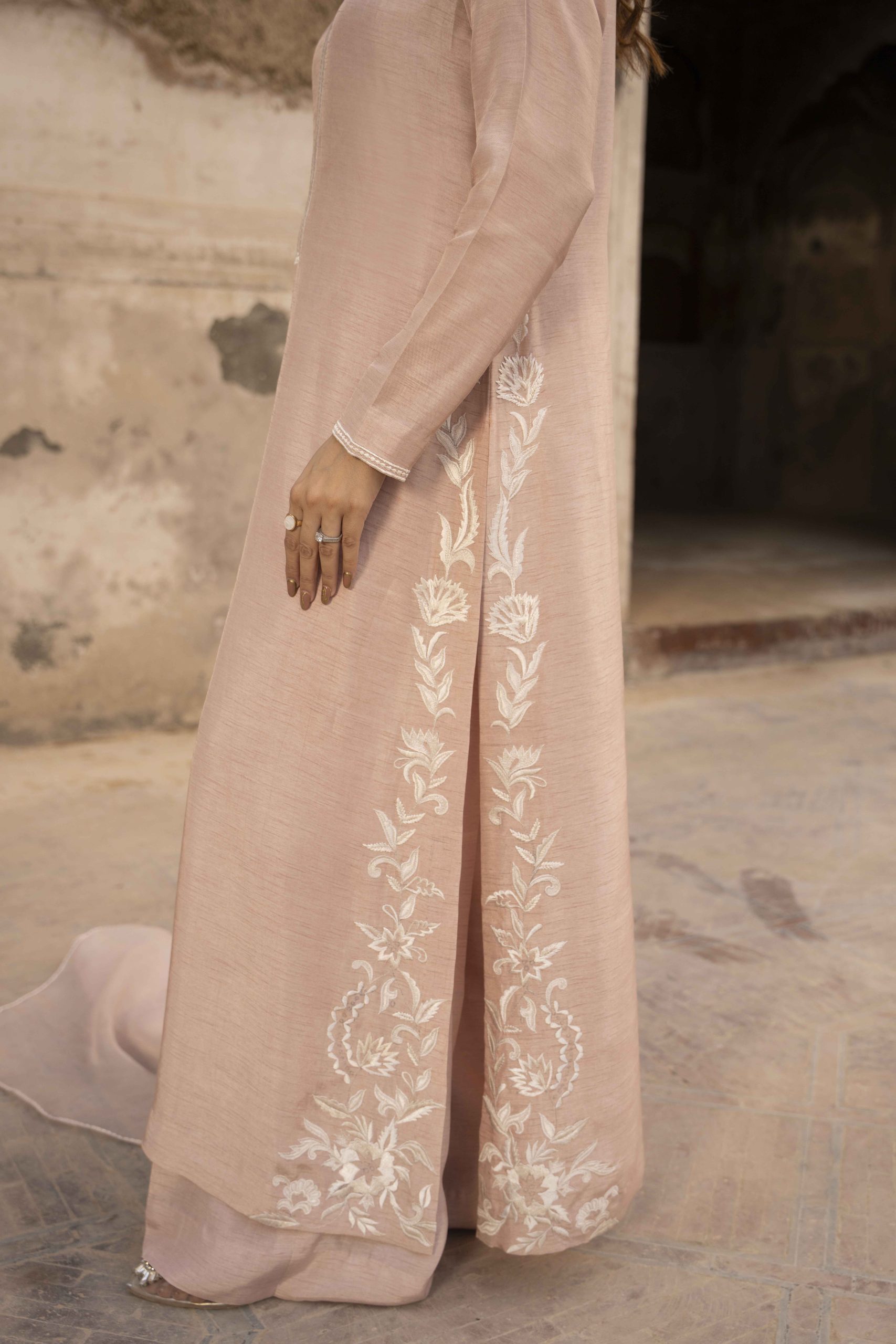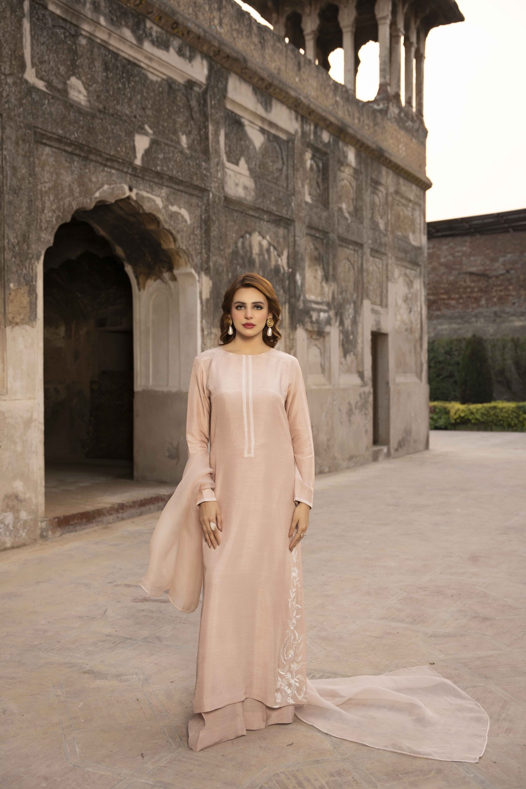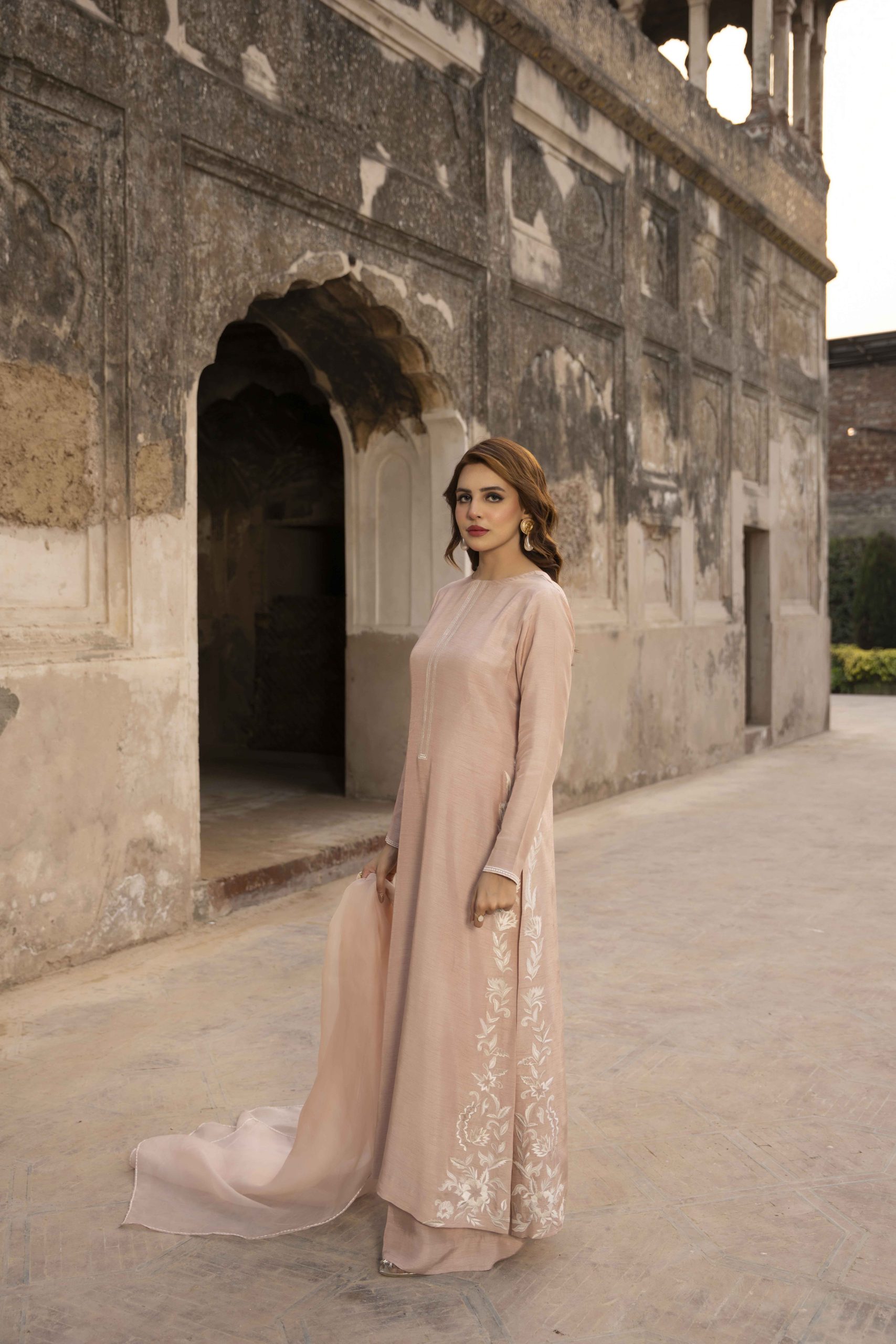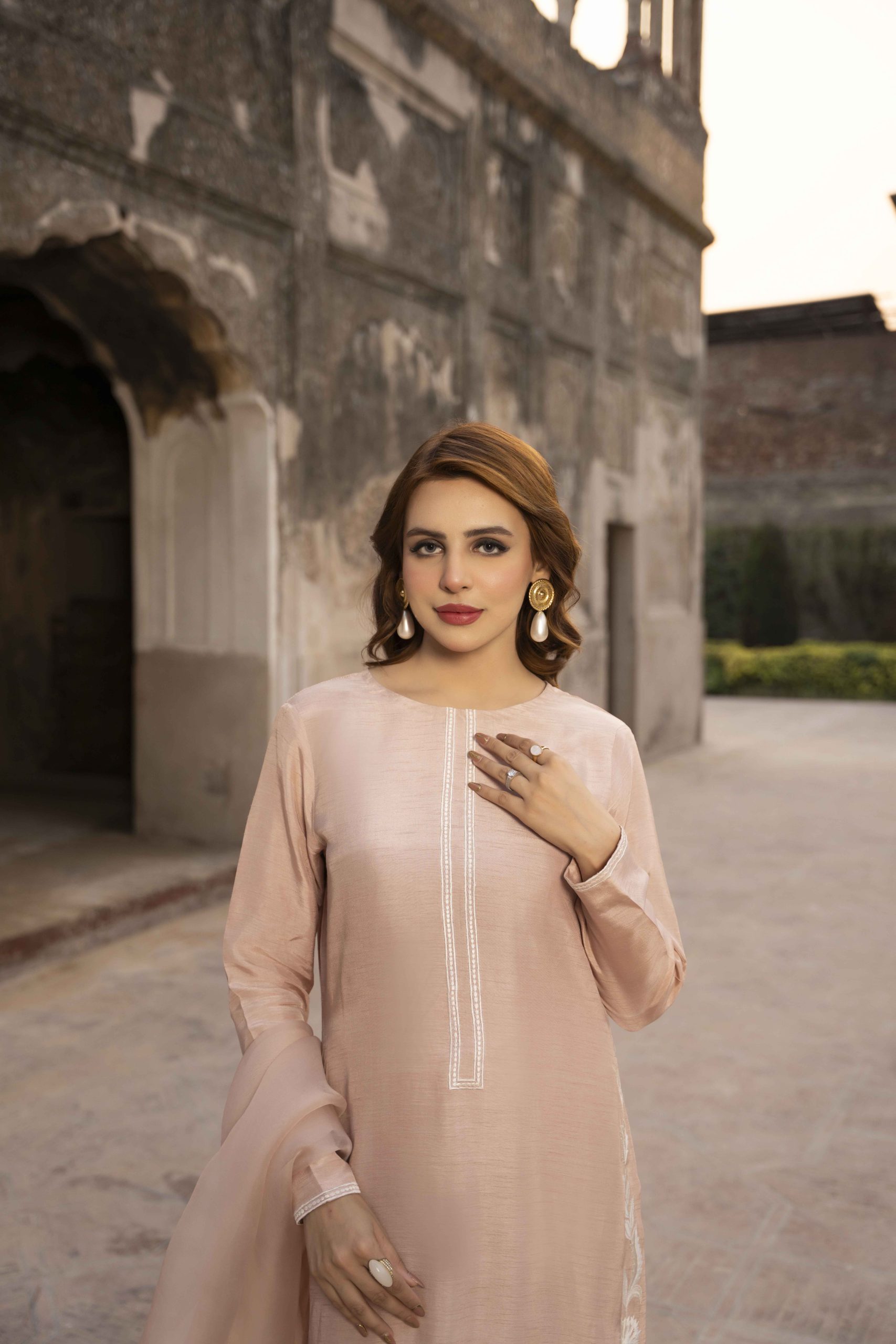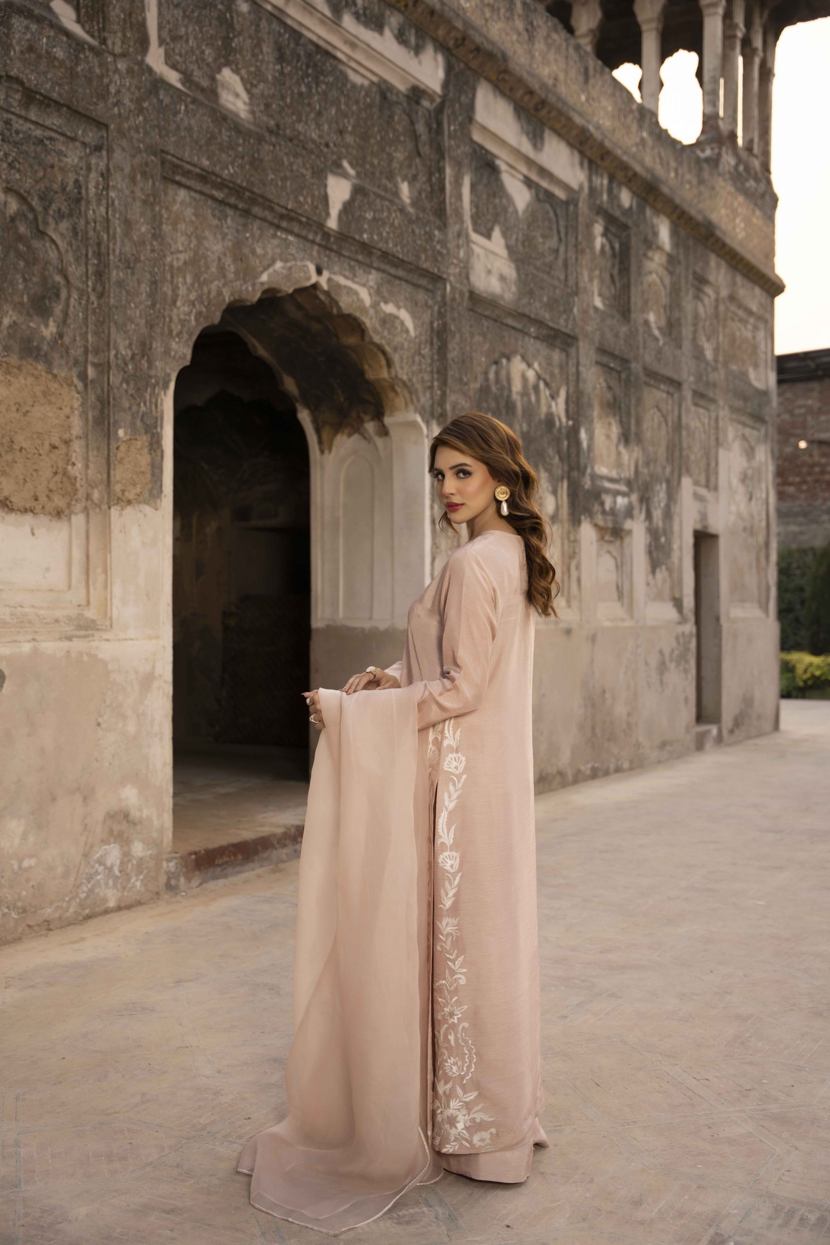 A vision of understated grace — Blush Reverie is crafted from luxurious Korean raw silk, delicately embroidered to create a poetic harmony of texture and tone. Paired with a sheer organza dupatta, this ensemble captures the essence of femininity and timeless sophistication. Its blush hue whispers serenity and charm, perfect for daytime festivities or refined evening affairs.