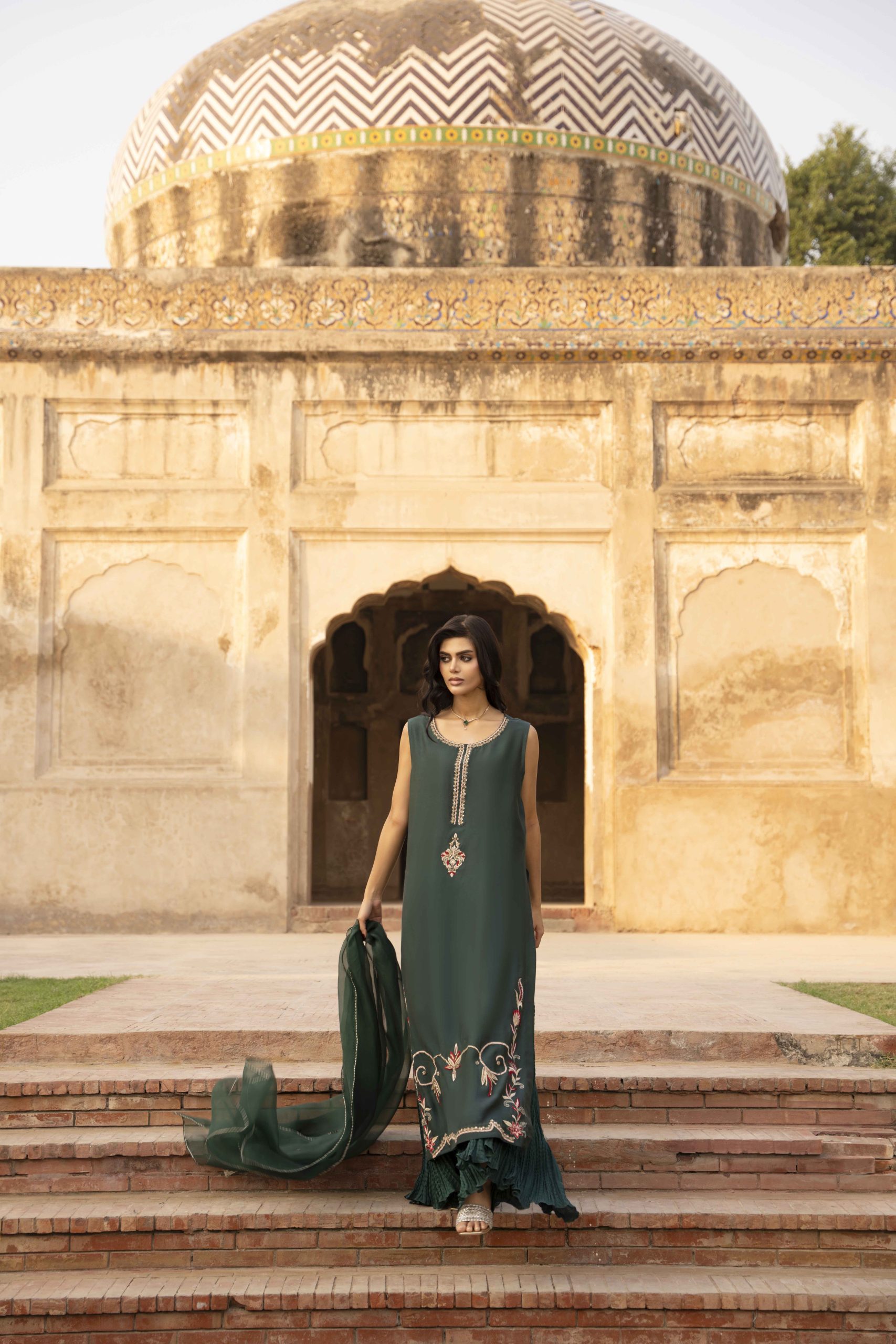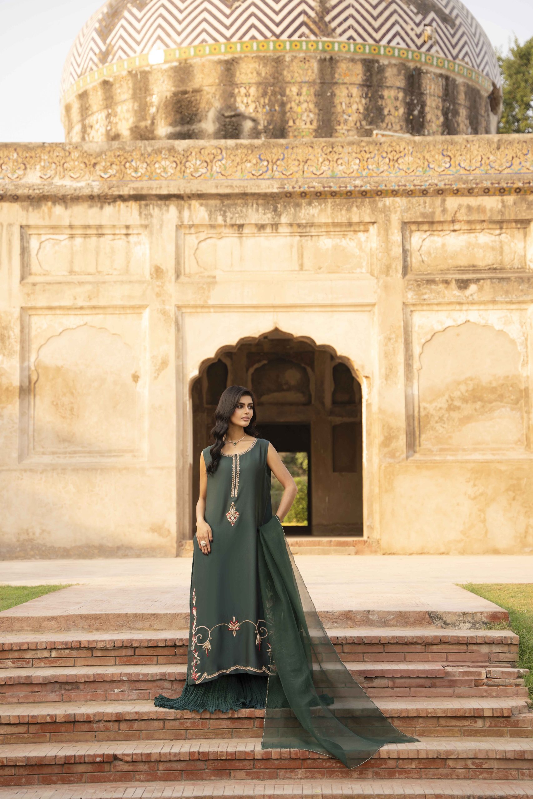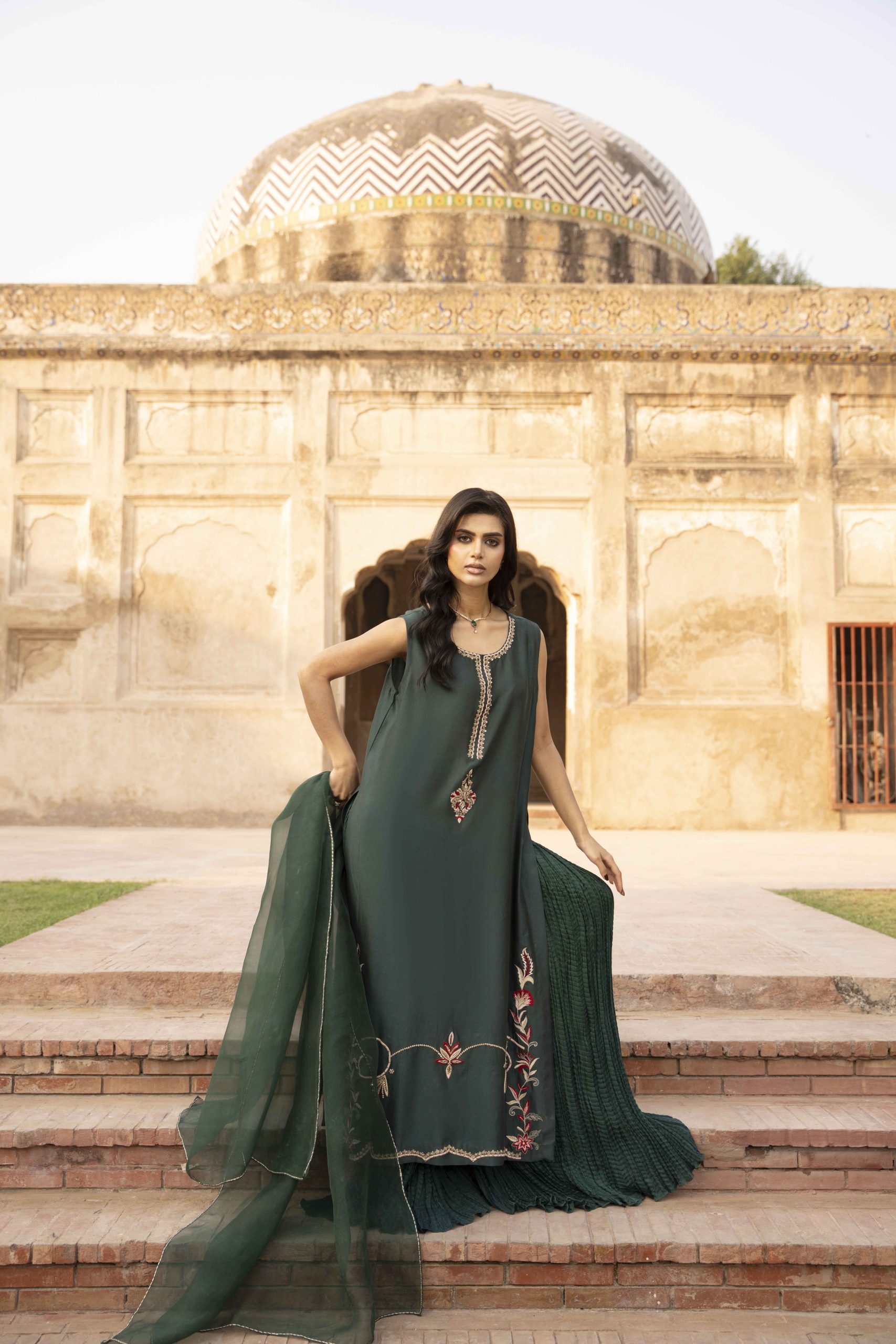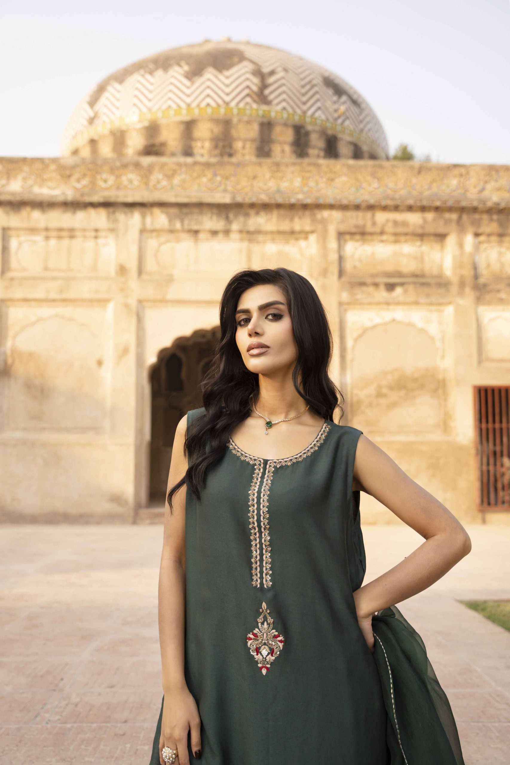 Grace draped in green — Emerald Muse is a masterpiece of elegance, featuring a meticulously hand-worked khadi silk shirt adorned with delicate embellishments that shimmer with understated luxury. Paired with silk crushed pants for a soft, fluid fall and a sheer organza dupatta that completes the look with timeless charm. Perfect for evening soirees and festive gatherings, this ensemble embodies sophistication, poise, and the quiet confidence of a modern muse.