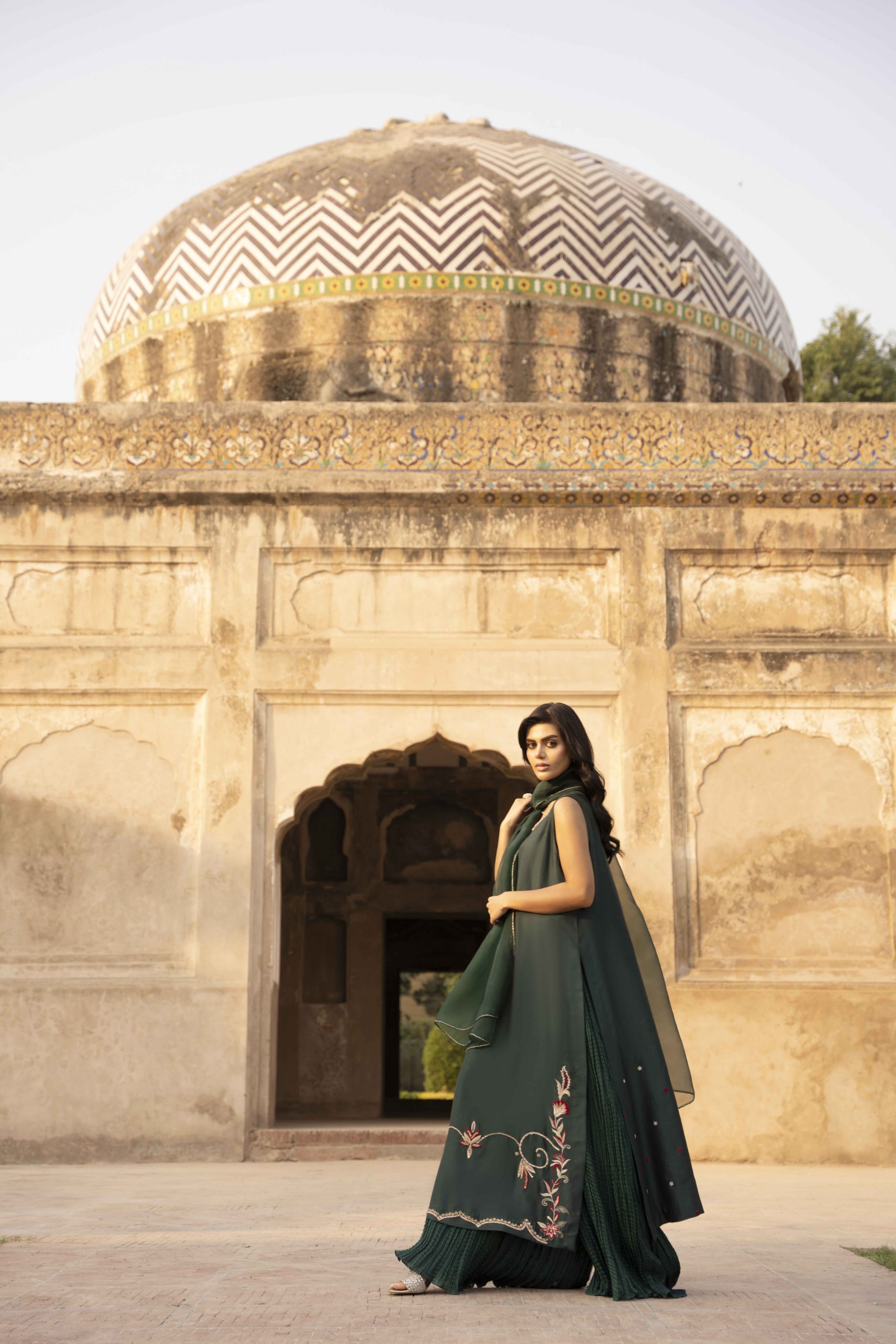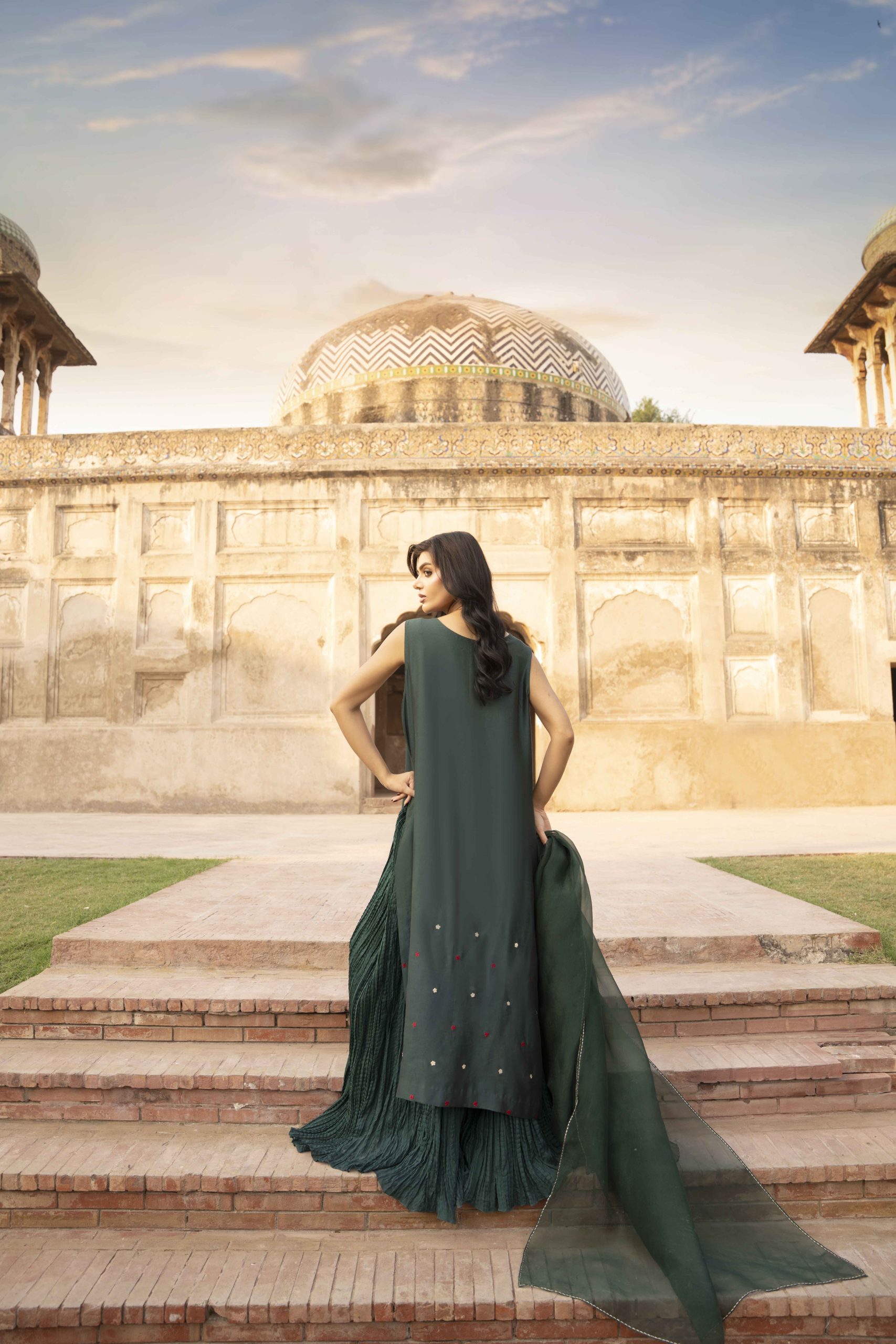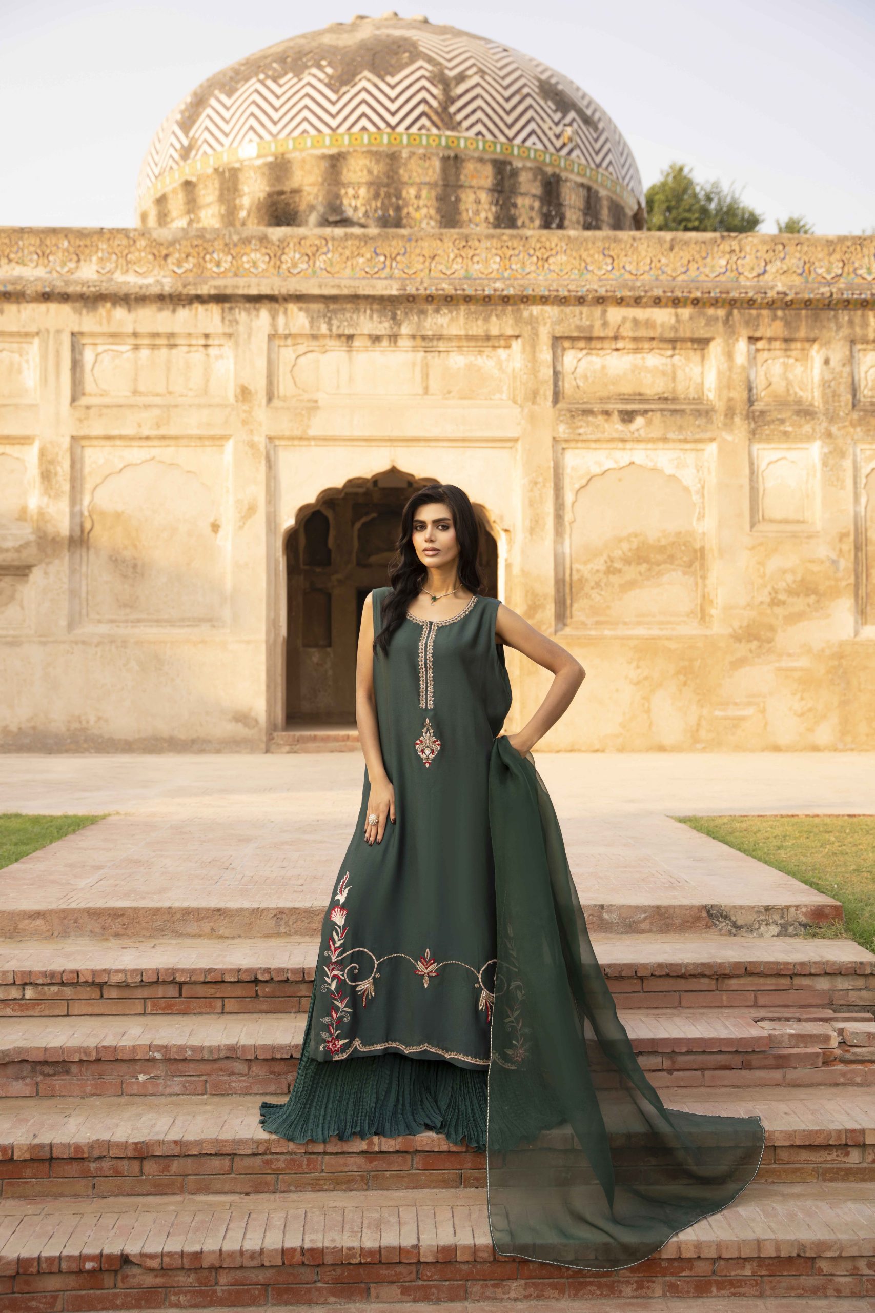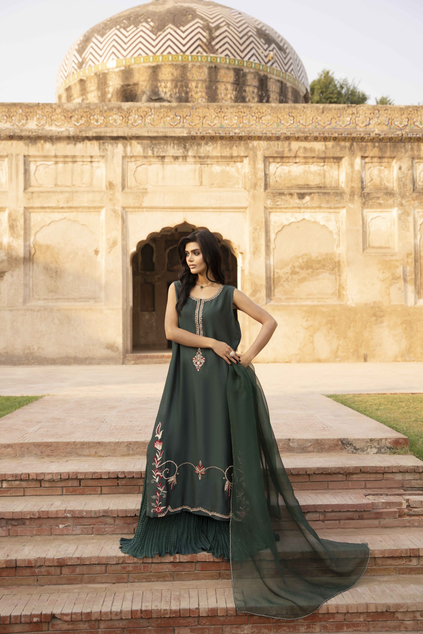 Grace draped in green — Emerald Muse is a masterpiece of elegance, featuring a meticulously hand-worked khadi silk shirt adorned with delicate embellishments that shimmer with understated luxury. Paired with silk crushed pants for a soft, fluid fall and a sheer organza dupatta that completes the look with timeless charm. Perfect for evening soirees and festive gatherings, this ensemble embodies sophistication, poise, and the quiet confidence of a modern muse.